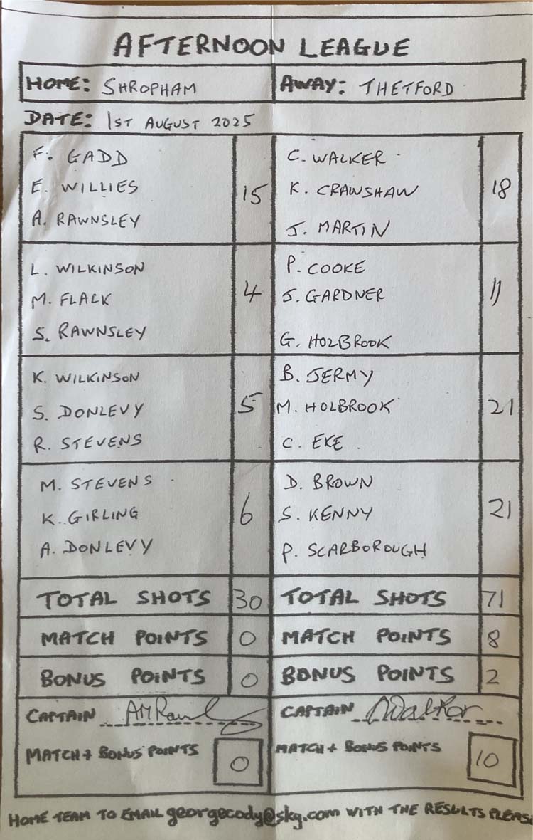 | 01 August | Shropham | 0(30) | v | Thetford | 10(71) | images/ScoreCards/01Aug25.jpg | |||||