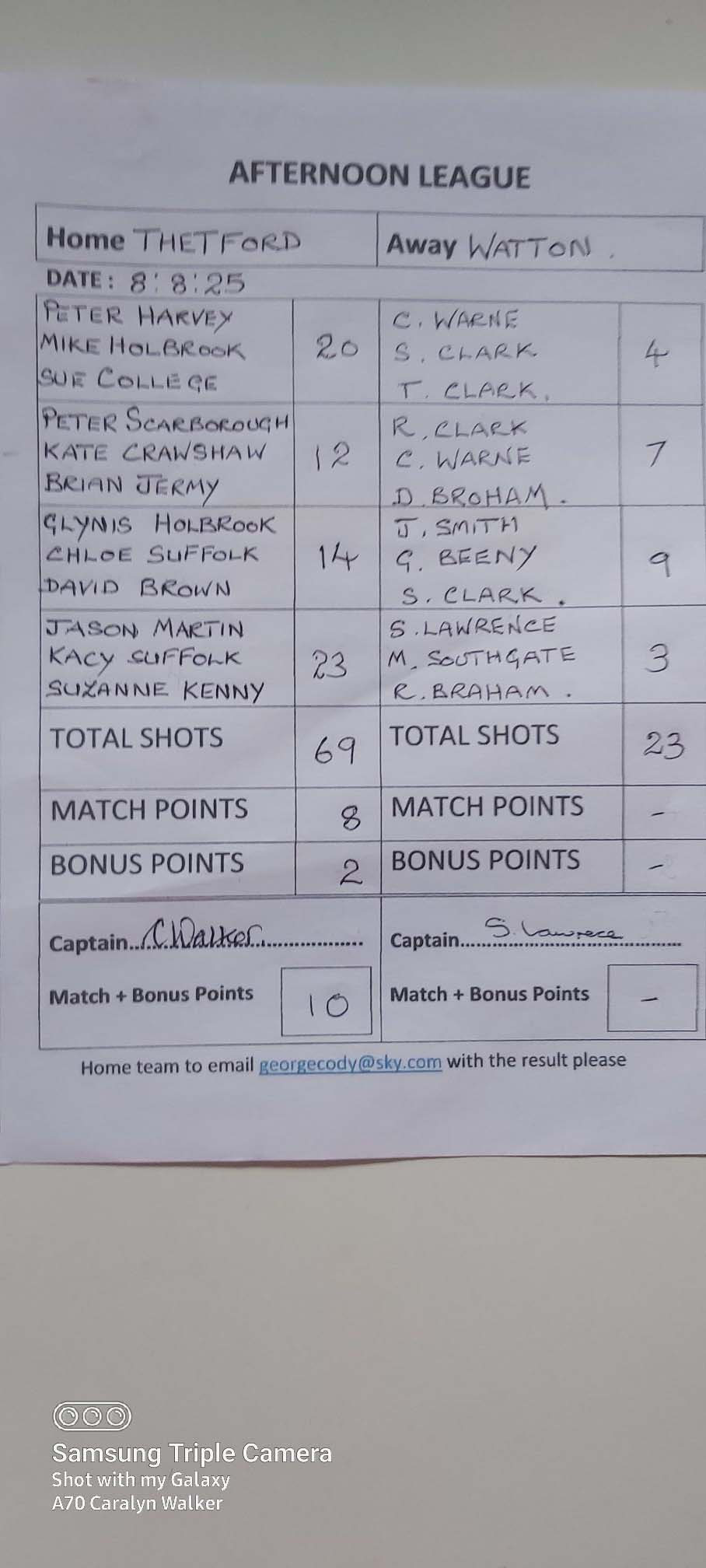 | 08 August | Thetford | 10(69) | v | Watton | 0(23) | images/ScoreCards/08Aug25.jpg | |||||