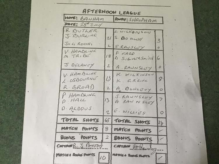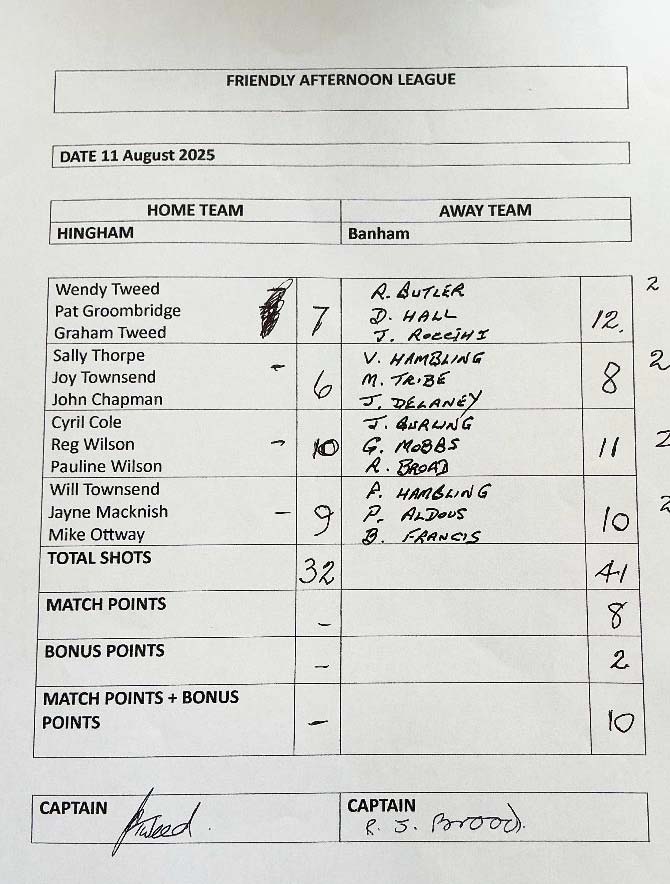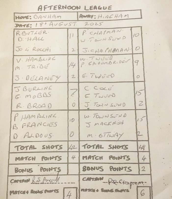 | 18 August | Banham | 4(42) | v | Hingham | 6(49) | images/ScoreCards/18Aug25.jpg | |||||