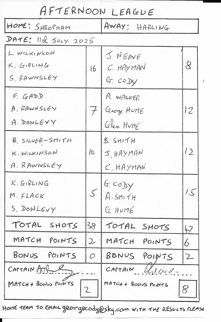 | 11 July | Shropham | 2(38) | v | Harling | 8(47) | images/ScoreCards/11Jul25.jpg | |||||