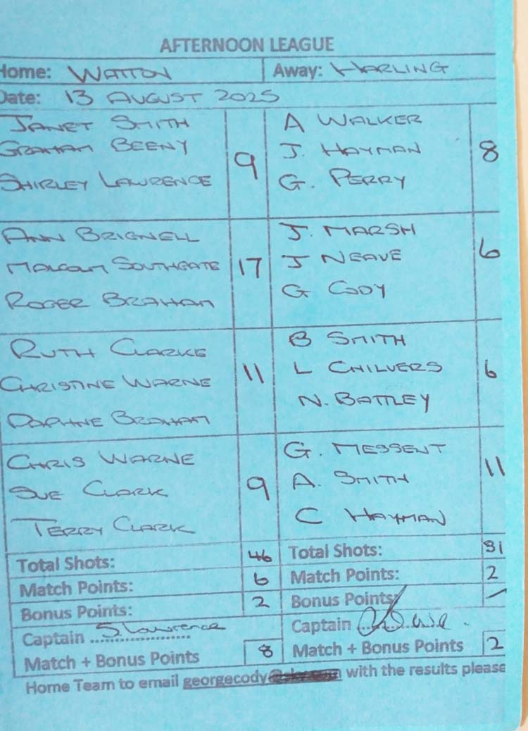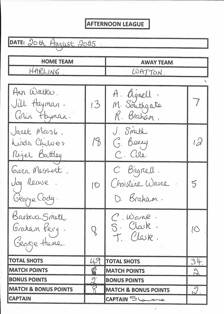 | 13 August | Watton | 8(46) | v | Harling | 2(31) | images/ScoreCards/13Aug25.jpg | |||||