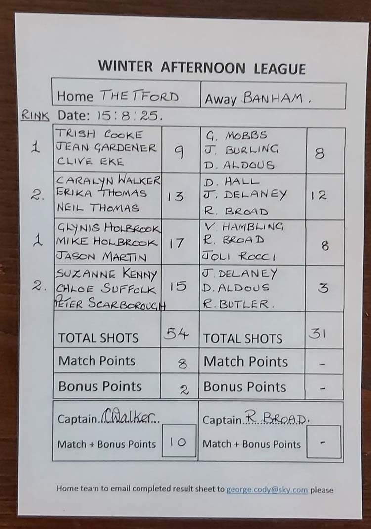 | 15 August | Thetford | 10(54) | v | Banham | 0(31) | images/ScoreCards/15Aug25.jpg | |||||