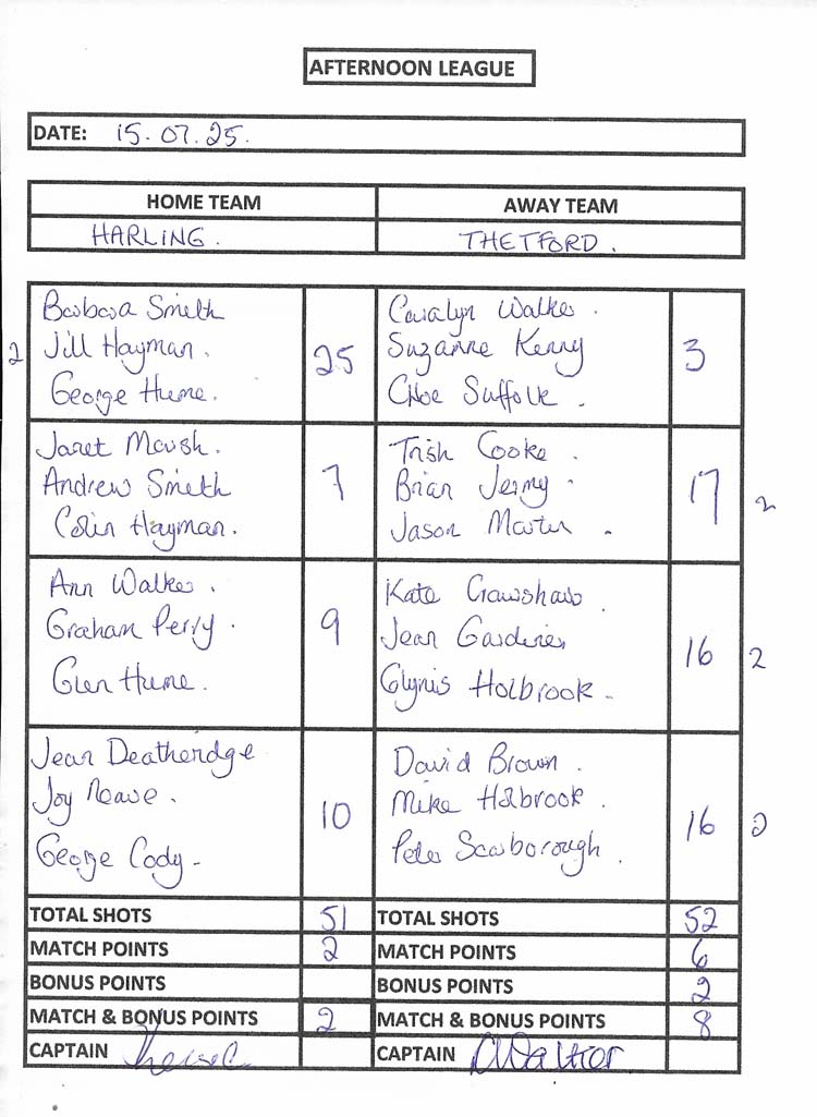 | 15 July | Harling | 2(51) | v | Thetford | 8(52) | images/ScoreCards/15Jul25.jpg | |||||