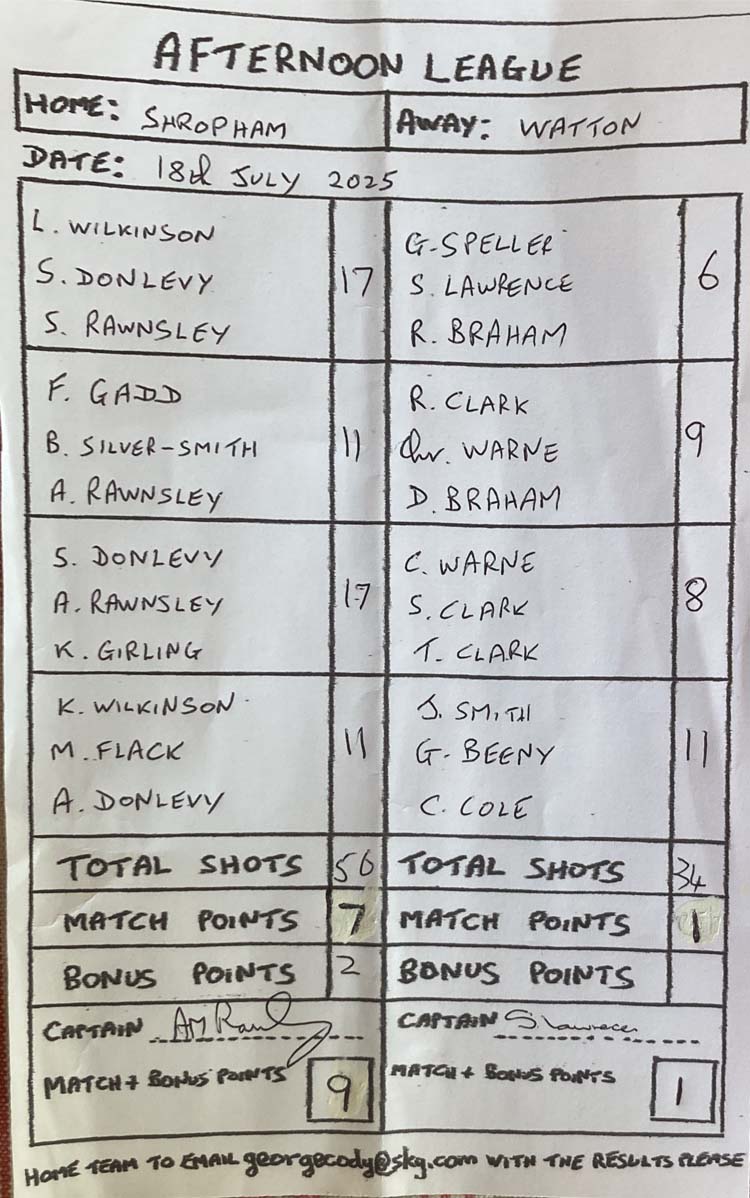 | 18 July | Shropham | 9(56) | v | Watton | 1(34) | images/ScoreCards/18Jul25.jpg | |||||