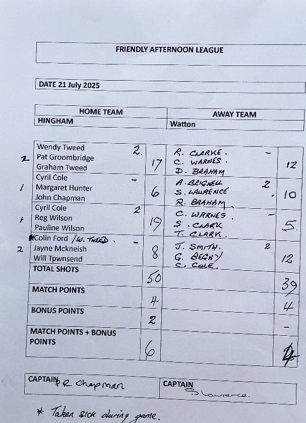 | 21 July | Hingham | 6(50) | v | Watton | 4(39) | images/ScoreCards/21Jul25.jpg | |||||