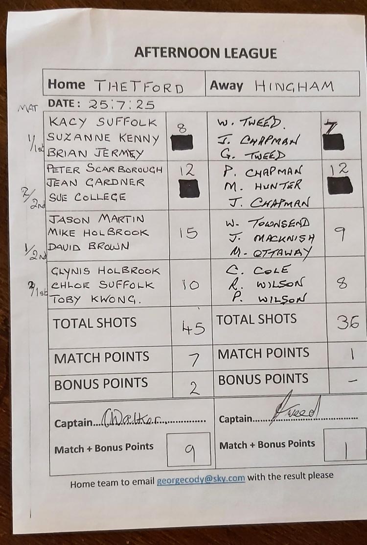 | 25 July | Thetford | 9(45) | v | Hingham | 1(36) | images/ScoreCards/25Jul25.jpg | |||||